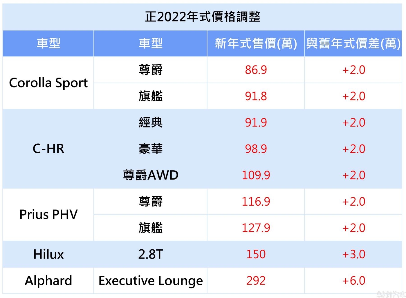 而先前未受影響的進口車,包含Corolla Sport、C-HR、Prius PHV、Hilux、Alphard等車款,也藉由正22年式全數調漲,其中以Alphard的6萬漲幅為最多。