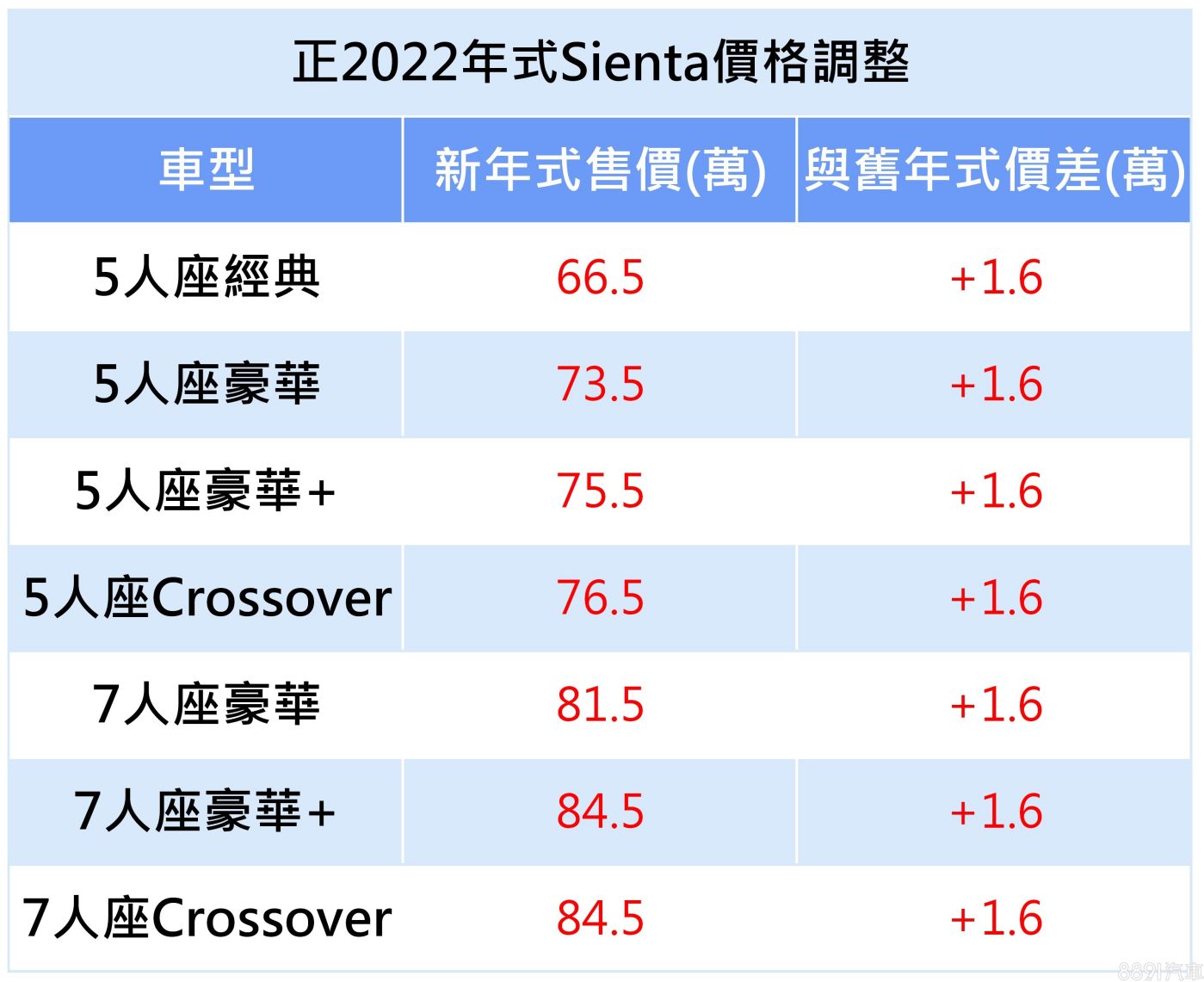 國內賣最好的小型MPV車型Sienta,最新公布的正22年式價格也統一調漲1.6萬,車型維持現售陣容,依舊提供5人/7人座的選擇!