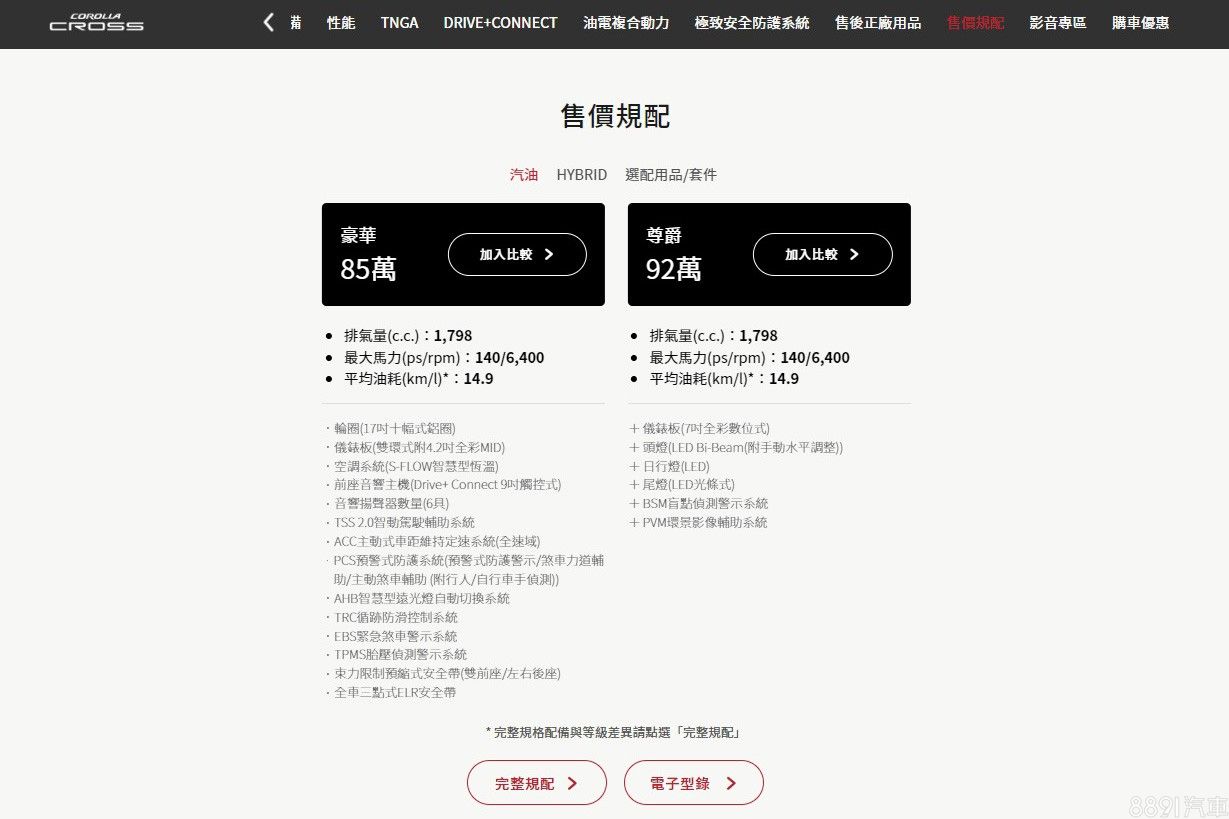 Corolla Cross原先採雙動力8車型編成,如今據官網公布的資訊來看,取消了要價80.5萬的入門汽油安心型,致使Corolla Cross入手價上漲為85萬元。此舉不僅讓人聯想,是為了和預計第三季亮相的Yaris Cross作出更明顯的產品區隔,保守估計,售價區間可望落70~85萬左右。