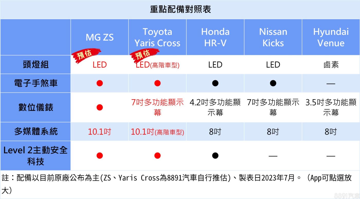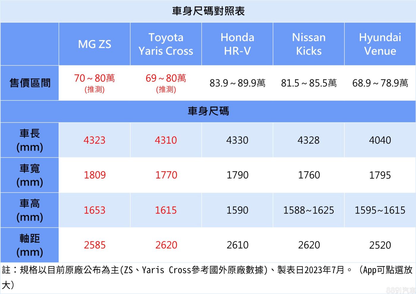 而主打好入手、高C/P值的MG,其下第二款產品ZS,我們推測也不會跟Toyota Yaris Cross,以及目前同樣主打低價的Hyundai Venue差太多,加上HS售價91.5萬起,為做出產品區隔,估計屆時售價區間應會落在70至80萬之間。