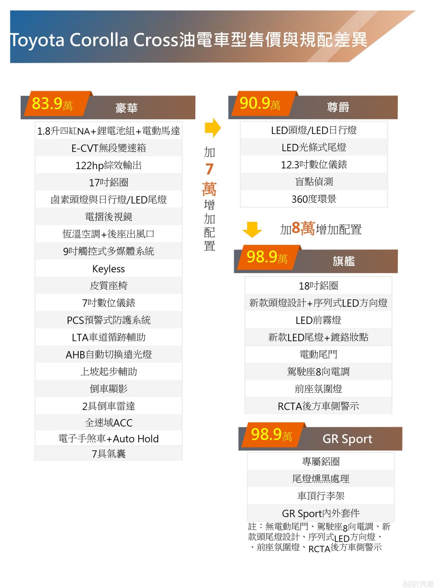 小改款Corolla Cross持續提供1.8升汽油與油電雙動力,汽油車型有3種選項;豪華、尊爵、GR Sport,售價分別為79.9、87.9和91.9萬,與先前相比,各車型降幅為6、6.1和2.1萬,重點規配如附表。