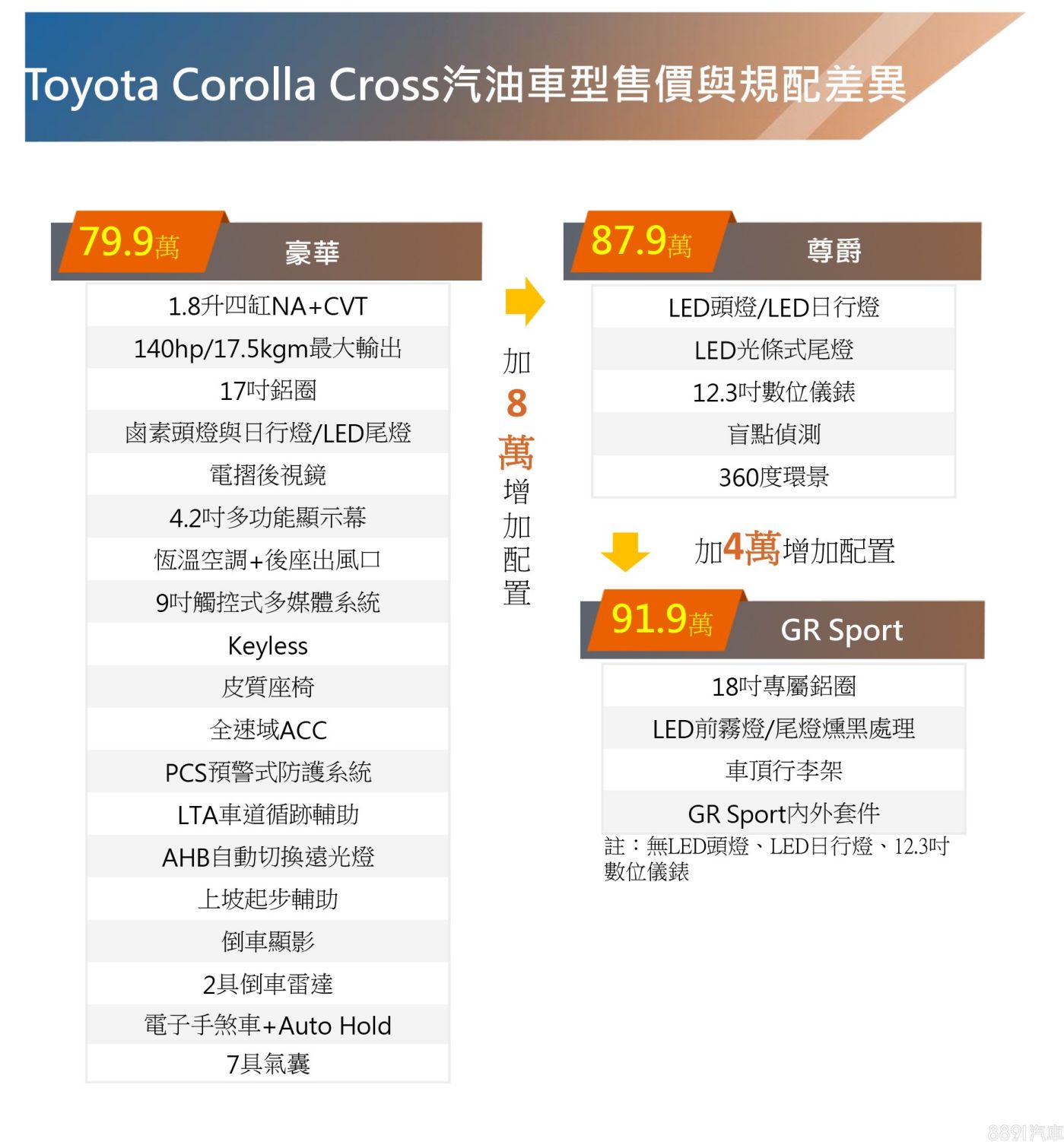 小改款Corolla Cross持續提供1.8升汽油與油電雙動力,汽油車型有3種選項;豪華、尊爵、GR Sport,售價分別為79.9、87.9和91.9萬,與先前相比,各車型降幅為6、6.1和2.1萬,重點規配如附表。