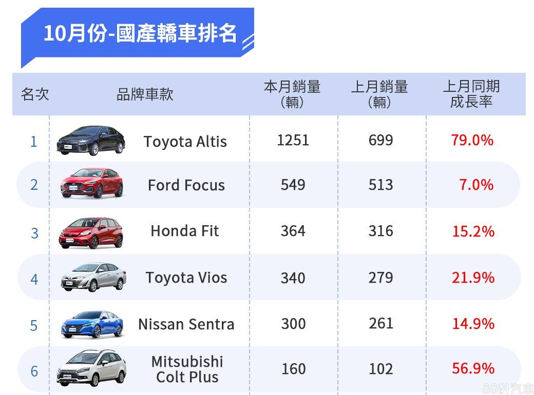 其餘國產轎車排名雖不變,但受促銷活動、政策紅利加持,表現也都不俗,無論是Ford Focus(549輛,+7%)、Honda Fit(364輛,+15.2%)、Toyota Vios(340輛,+21.9%)、Nissan Sentra(300輛,+14.9%)、Mitsubishi Colt Plus(160輛,+56.9%)對比上個月都有顯著成長。