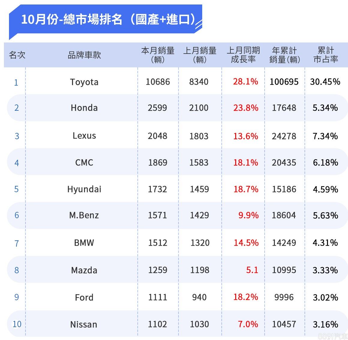 在買氣回暖下,各品牌銷量也是「紅通通」,前五名分別為Toyota(10686輛)、Honda(2599輛)、Lexus(2048輛)、CMC(1869輛)、Hyundai(1732輛),其中又以Toyota成長28.1%為最多,當家車款亮點不少,像是Corolla Cross逼近4千輛、Altis也罕見地重回千輛規模。