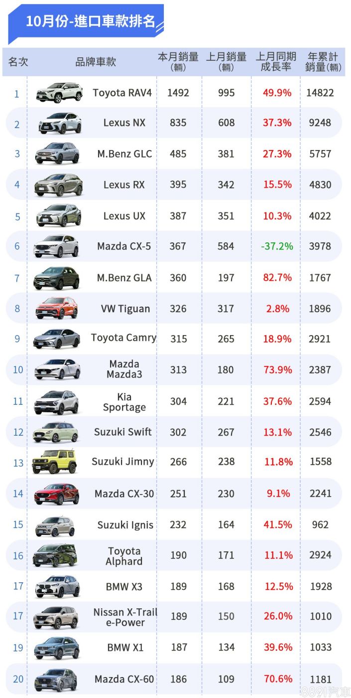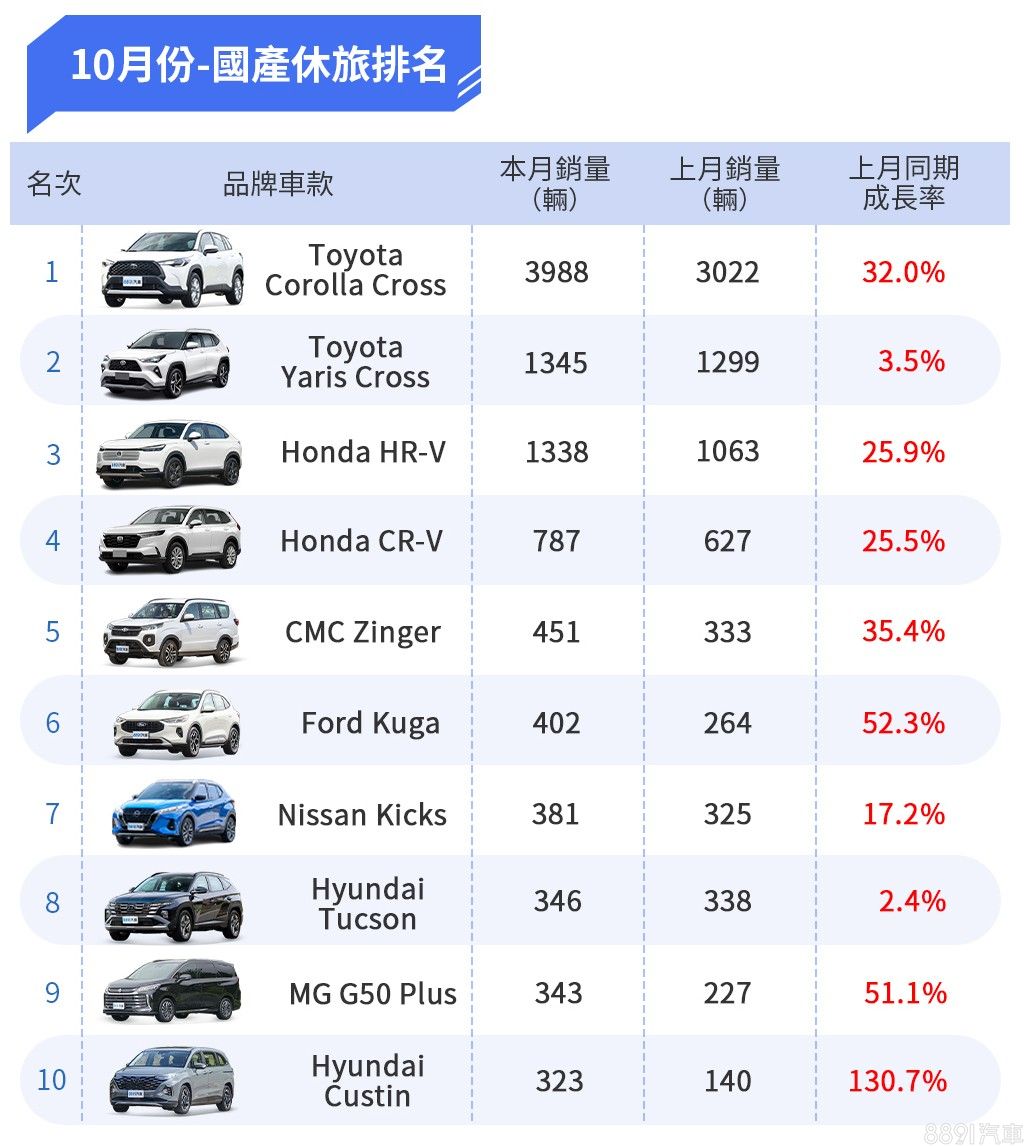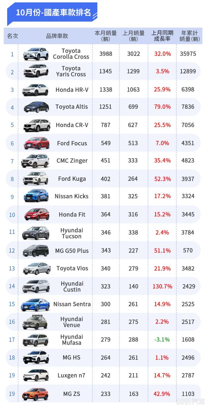 國產車Top 20榜單沒有太大波動,除了Mufasa外,其餘車款較9月都有成長,其中上揚最多的是Custin,掛牌323輛、月增130.7%,顯見新上市的2.0T車型獲得不少「動力派」買家的親睞。