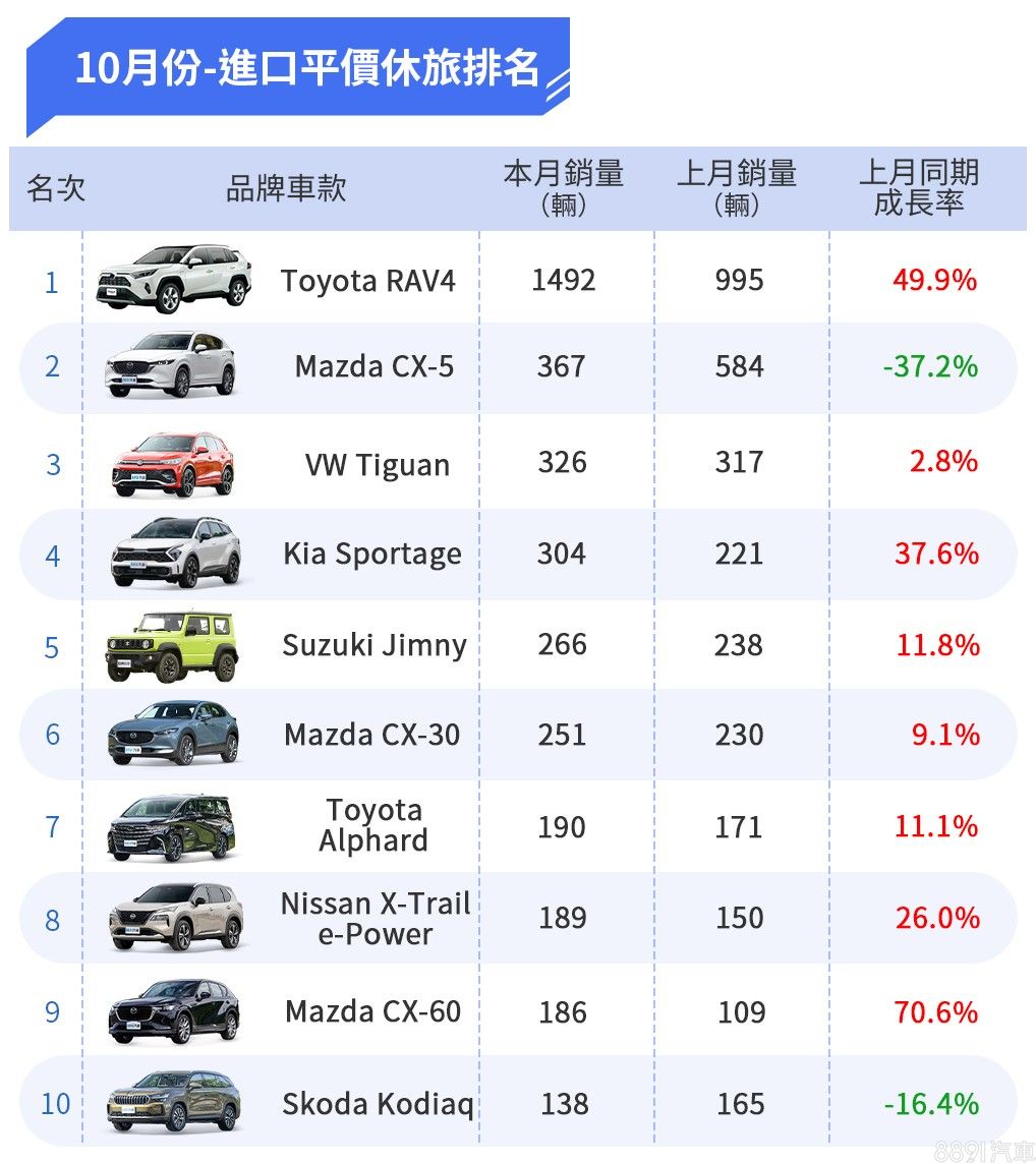 在競爭最激烈的進口平價休旅市場,Mazda的新世代戰將CX-60正努力證明身手,繳出70.6%的最高月成長率,顯示新車型正積極拓展市場並提升交車效率。然而,更驚人的是即將迎來大改款的Toyota RAV4,竟還能繳出49.9%的亮眼增長,單月銷量達1492輛,其中光油電版本就佔了828台,徹底展現其在休旅市場與油電級距中,無可撼動的「神車」地位。