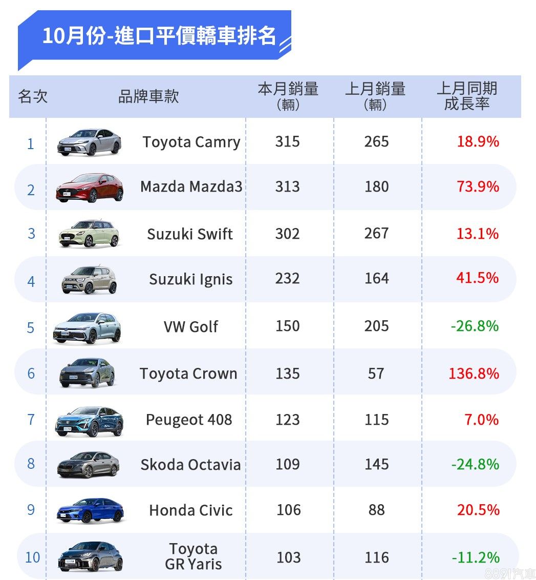 日系資優生Mazda3在10月份同樣展現強勁的成長力道,73.9%的月增率使其銷售排名躍居第二。其中五門與四門車型雙箭齊發,分別繳出83.3%與51.9%的增長,為Mazda品牌貢獻了穩定的銷售基礎。此外,都會小車Suzuki Ignis也以41.5%的成長率,成為榜單中的另一匹黑馬。