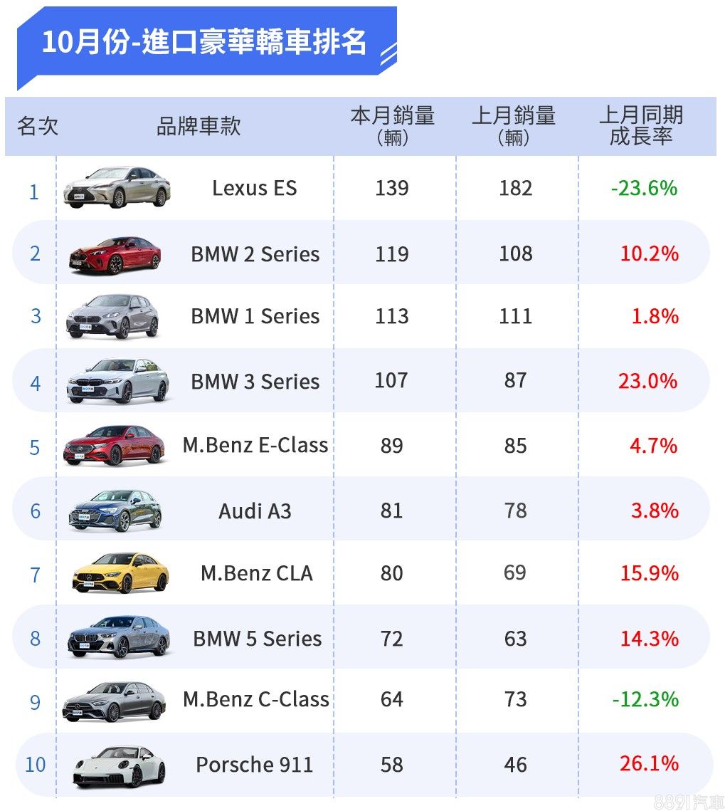 在進口豪華轎車中,Porsche 911展現了最高的上月同期成長率,達26.1%,本月銷量為58輛。911在10月的交車數明顯優於上月的46輛,這表明即便在高價跑車市場,市場需求依然強勁,且Porsche能夠有效排程交車。品牌整體在10月的上月比為108.1%,顯示911的強勢表現對品牌的貢獻不小。