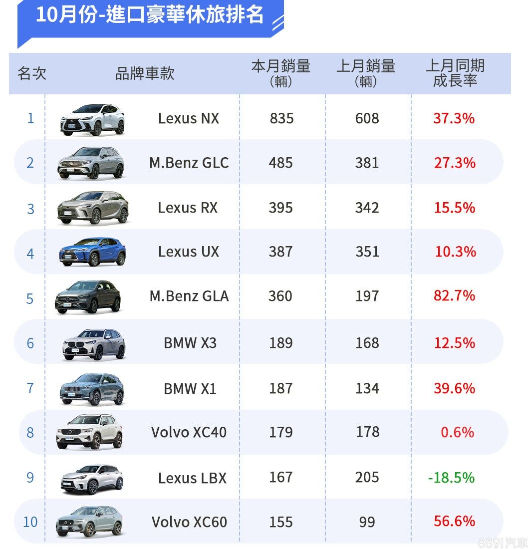 豪華休旅戰場同樣精彩,賓士GLA上演銷量翻倍的戲碼,以高達82.7%的月增長率,一舉衝上排行榜第五名,顯見其在豪華入門級距中受到強烈歡迎,很可能是大量新車到港集中交車的成果。