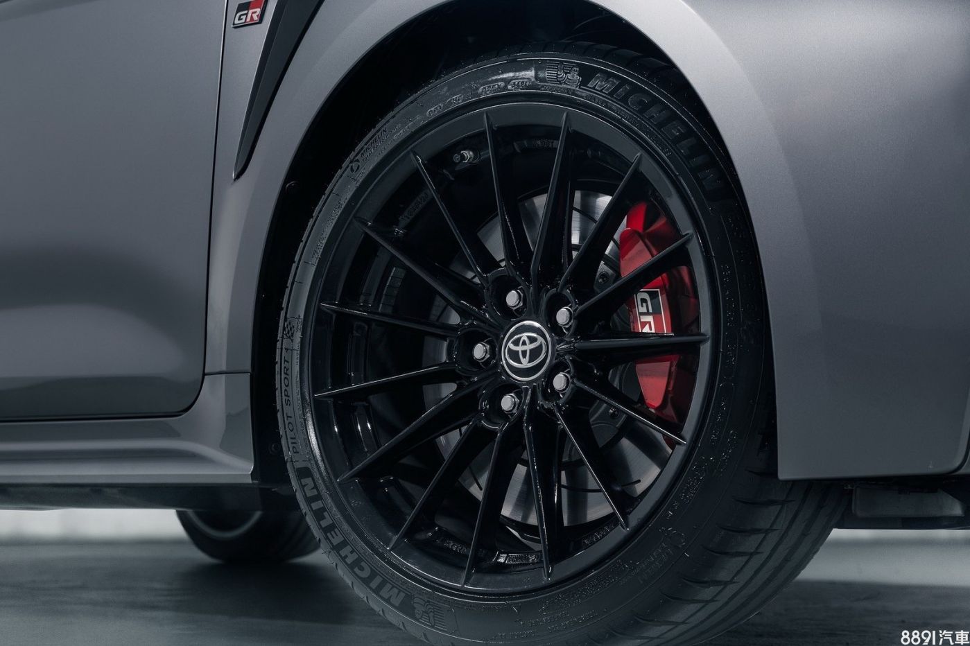 為了配合新車更強勁的輸出和性能化取向,Toyota也針對GR Corolla的車身剛性與懸吊系統進行強化,並於車頂、引擎蓋、車門等處使用輕量化材質,原廠為其配置的是18吋亮黑塗裝鋁圈,以及尺碼為235/40R18的Michelin Pilot Sport 4配胎,另擁有前四活塞卡鉗、前356mm、後297mm之碟盤。
