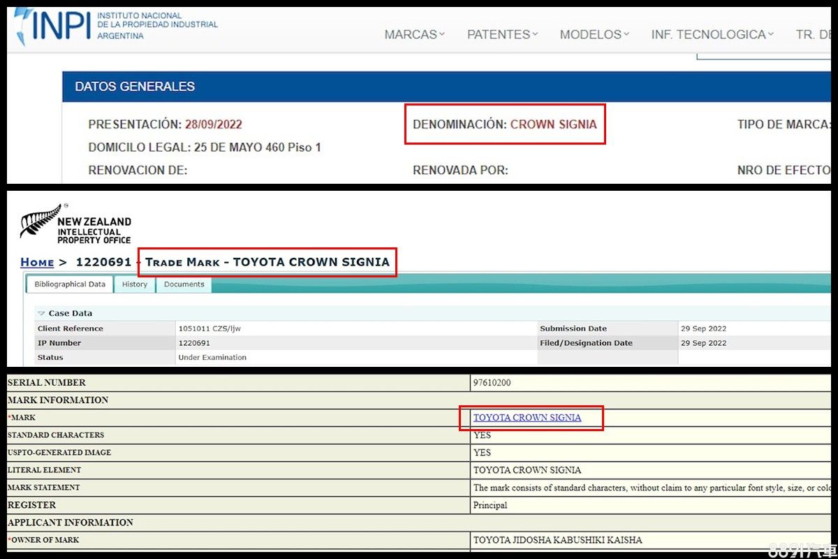 從美國、法國和紐西蘭的商標申請資訊中,皆可見到Toyota註冊了「Crown Signia」的商標權,但背後用意不明。畢竟註冊僅代表原廠取得該商標權,但不一定會實際使用在上市車款上,而官方也未透露任何相關資訊。
