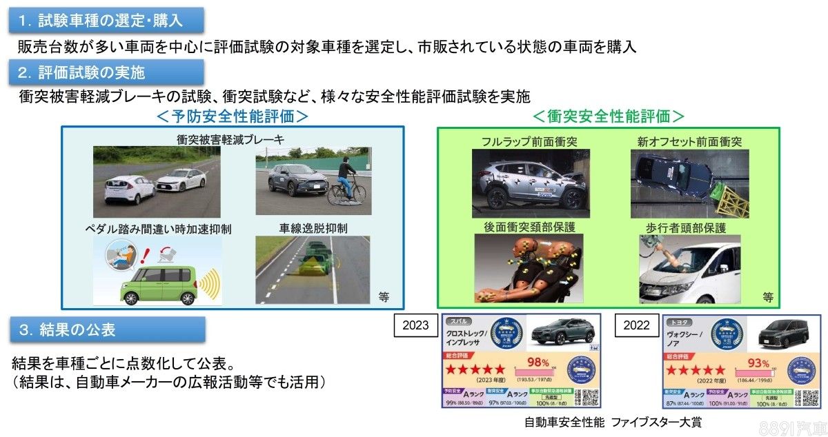JNCAP評測主要分成「預防安全」、「衝突安全」與「事故自動緊急通報裝置」三個項目,滿分各為100分、85.8分與8分,最高分為193.8分。要取得五星認證需在前兩項都評價「A」,最後再由綜合分數最高者,成為年度最安全新車大賞。