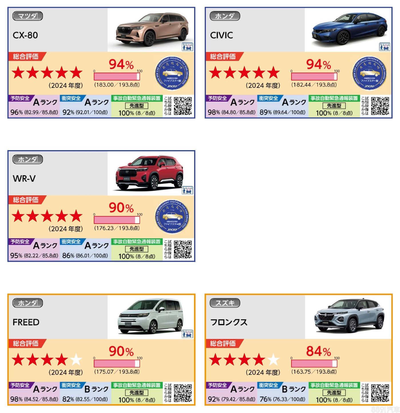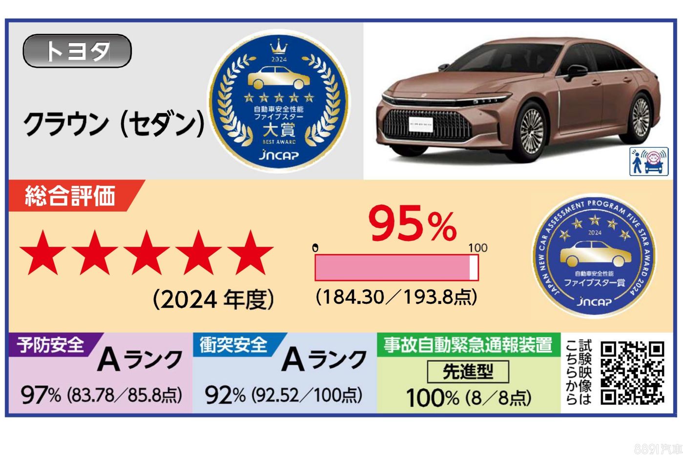 日本JNCAP公布2024安全車款評鑑結果,送測車款共計6款新車,Toyota Crown Sedan、Mazda CX-80、Honda Civic及WR-V都拿下五顆星評等,不過Crown Sedan在評審項目中獲得了184.30的最高分,成功摘下JNCAP年度最安全大賞的頭銜!