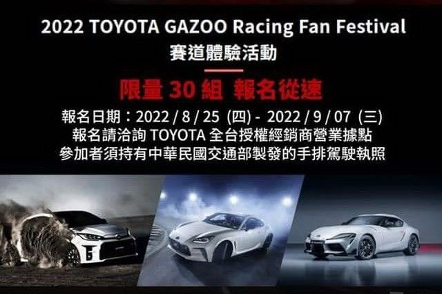 隨著GR Supra手排版的現身,和泰汽車也預告將於10/19首度舉辦Toyota Gazoo Racing Fan Festival賽道體驗活動,邀請專業車手教練團隊精心規劃,可在麗寶賽道上駕駛GR 86、GR Yaris,GR Supra等車款,還有「甩尾帝王」馮仁稚帶領學員體驗極速甩尾飄移的刺激感。限量30位名額,更多詳細資訊與活動報名可洽活動官網。