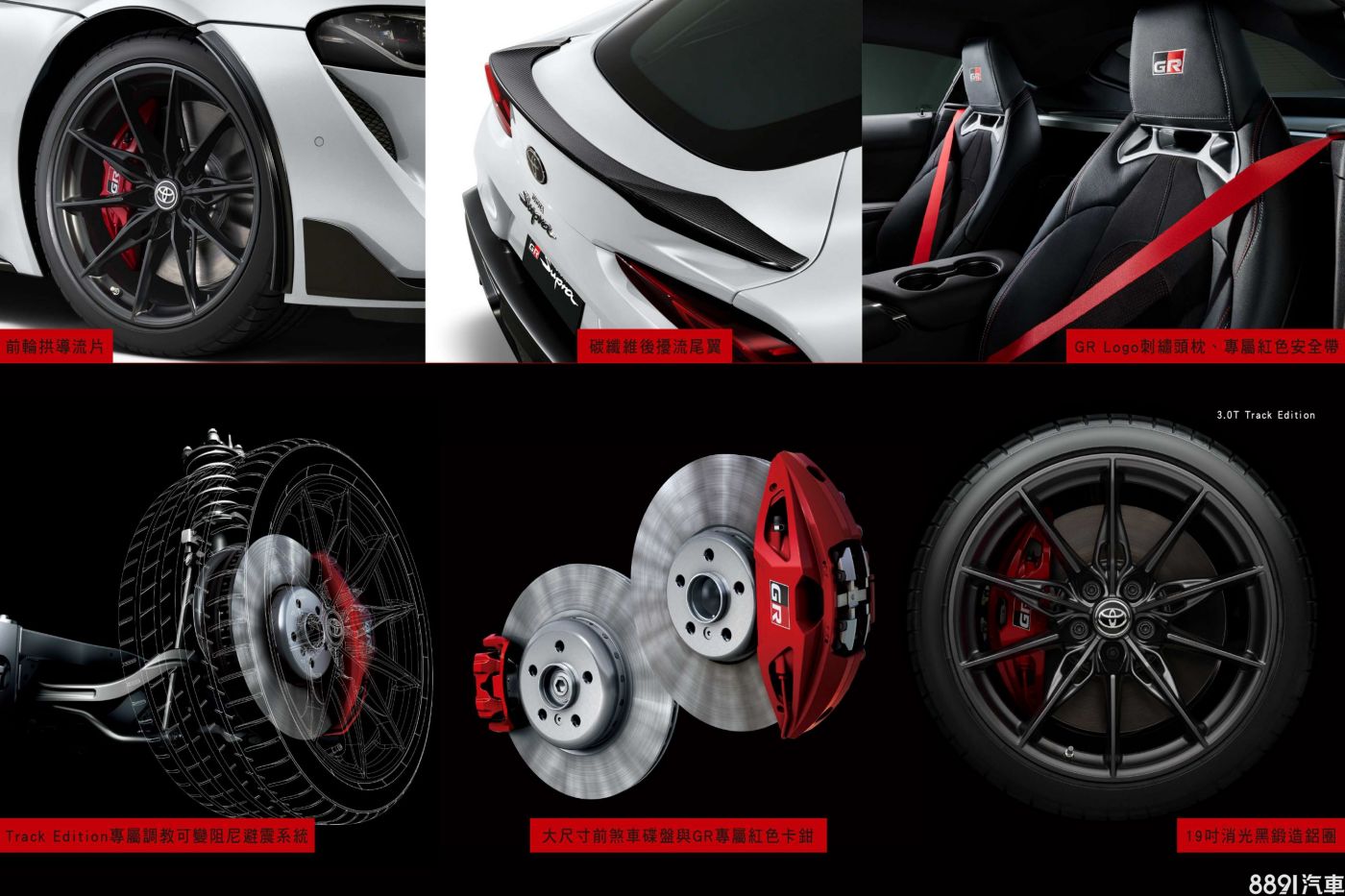 賽道版Supra在外觀上配備前輪拱導流片、碳纖維尾翼等專屬空力部品,鋁圈也改搭消光黑塗裝。此外,特仕版不僅具備專屬調校的電子懸吊系統,前煞車系統也換上大尺寸碟盤和GR出品的紅色卡鉗,官方宣稱在操控表現上有所助益。