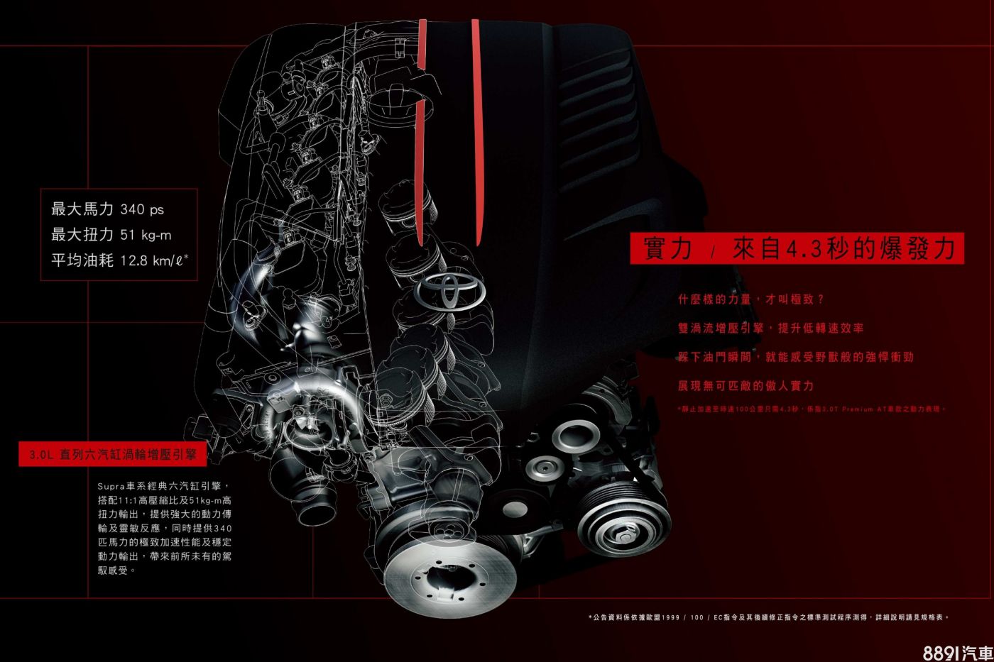 動力沿用原頂規「3.0T Premium AT」的配置,搭載3.0升渦輪直六引擎,最大輸出340hp/51.0kgm,銜接8速手自排及前置後驅的傳動設定,原廠數據並指出,自靜止加速至100km/h僅需4.3 秒!
