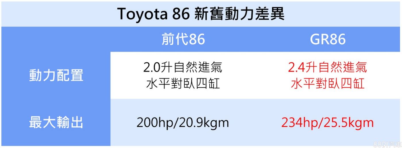 動力方面,雖說同樣搭載自然進氣水平對臥四缸引擎,不過GR86缸徑從86mm加大為94mm,排氣量也隨之從2.0升增至2.4升,換來234hp/25.5kgm的最大出力,並提供6速手排或手自排車型可選。