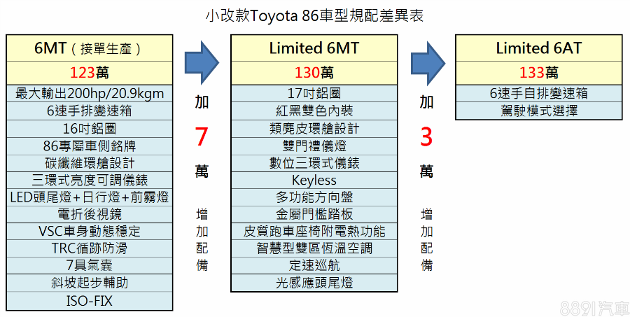 國內小改款86車系採86 6MT、86 Limited 6MT與86 Limited 6AT三種車型編成,其中6MT車型為接單生產,正式售價分別為123萬、130萬及133萬元,全車系售價較前代均調漲6.1萬元。