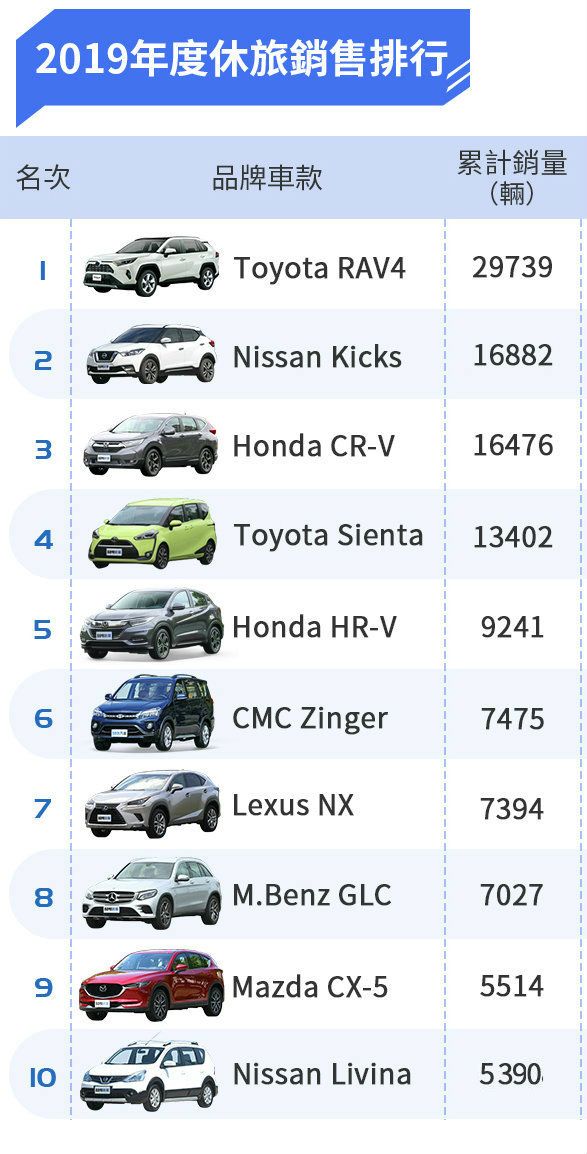 台灣2019休旅銷售排行中,全年銷售成績破5000輛者,方可登上Top 10排榜,而登榜者則以國產老面孔居多。由於休旅風潮的持續流行,前四名次均繳出破萬輛的年銷量,首位的RAV4更險些叩關3萬門檻,而位居第五的HR-V也有超過9000輛的表現。