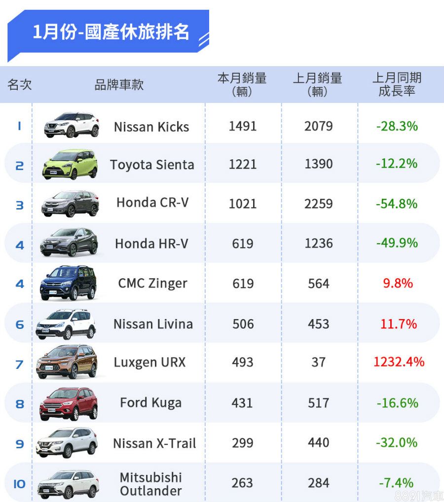 Kicks在2020年第一個月就展現新任「國產休旅一哥」氣勢,雖說為負成長,但仍舊位居第一,反之CR-V雖銷量破千,但落後於穩健表現的Sienta,僅排第三,今年是否能靠小改款搶回自身地位,值得觀望。