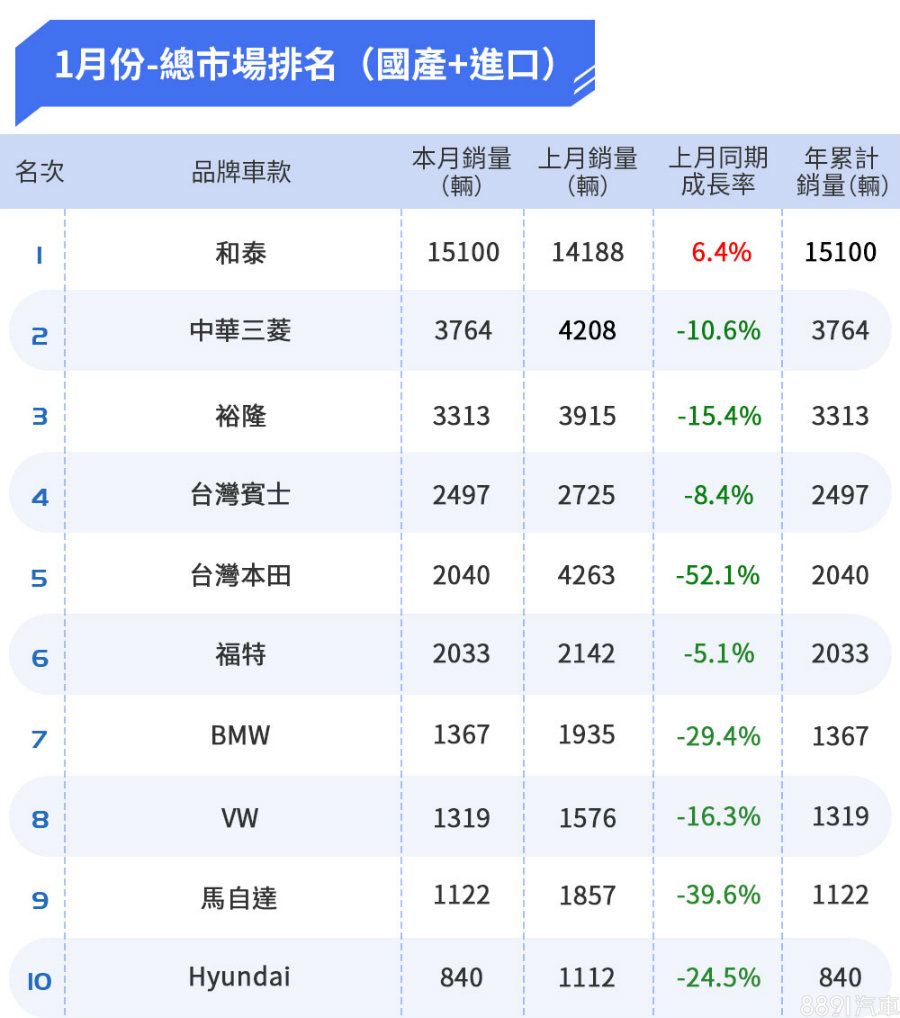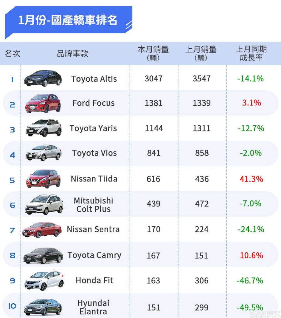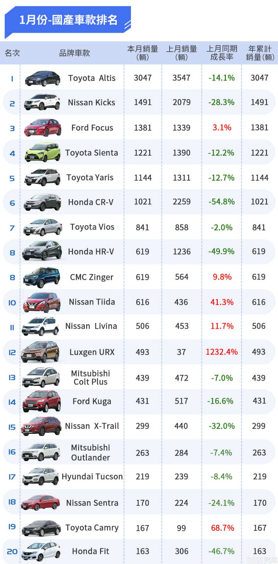 國產榜上一直以來各車款間的順序、變動都不大,受到總統大選和農曆春節眾多假期影響,加上去年12月發表新車多為進口車款,國產實為少數,榜上銷量多為負成長。