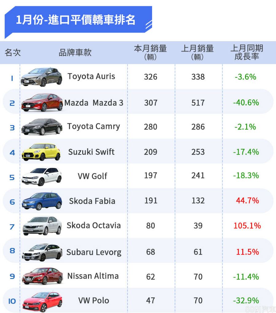 而在去年第四季表現一直相當良好的Suzuki Swift,本月份僅繳出了209輛的成績,銷售表現上略顯頹勢,整個品牌的後續成績值得觀察。另外在Skoda的部分表現相當不錯,Fabia銷售出了191輛,成長44.7%之多,新年式的車型足夠吸引人,即便價格上有些微的調整也不受影響,Octavia表現也令人意外,銷售了80輛,成長達105.1%之多,也是近幾個銷售月以來此車型最佳表現。