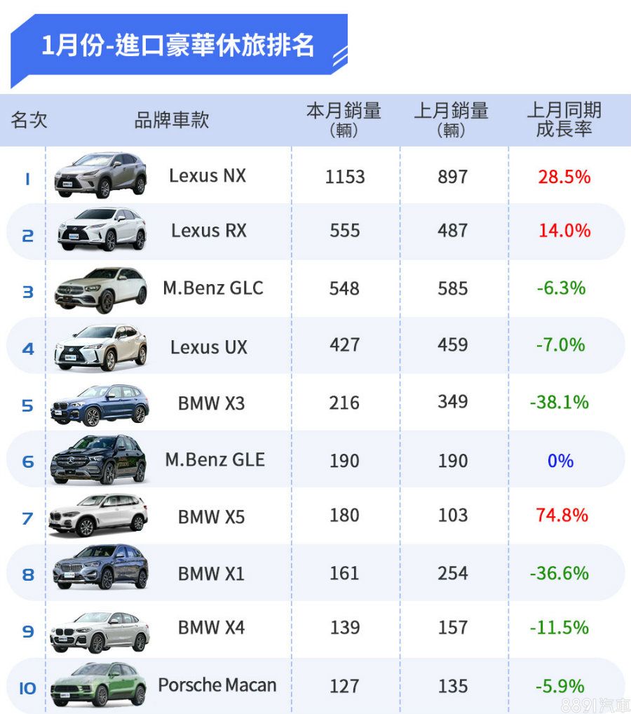 2020第一個月份,NX便開出紅盤,繳出1150輛掛牌數,不僅多過於第二、三名銷售量之總和,更與RAV4成為進口市場唯二拿下單月四位數銷量的車系!而上個月推出零利率分期專案的RX,也以14.0%的漲幅,成功擠下GLC拿下亞軍。