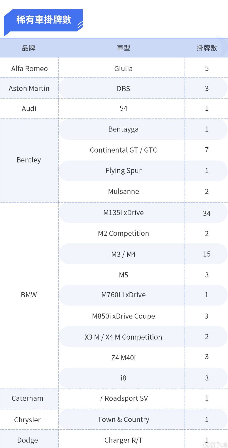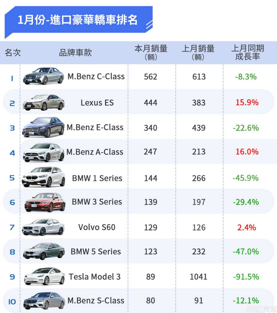 另外值得注意的是榜單當中未見Tesla任一款車,看來去年底引發的電動車熱潮已經退燒,本月份Tesla僅繳出了112輛的成績單,Model 3僅有89輛,對比去年12月的破千輛佳績宛如天地之別,未來Tesla的銷售可能還要觀察政府在充電基礎建設方面的建制以及超級充電的收費高低來決定,電動車能否順利在台灣續存也是市場觀察重點。