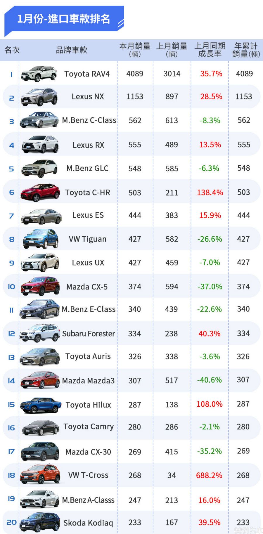 看到進口車款綜合排名,還是看得出SUV車型的熱門程度,第一的RAV4甚至擊敗了Altis,這現象在去年底的銷售月份當中也有看到,究竟2020年新神車會是誰,還要再觀察幾個月才能知曉,第二名的Lexus NX也成長了28.5%,破千輛的佳績也站穩了豪華品牌一哥的位置,而前十名當中僅有C-Class以及ES不是休旅車款,其餘8輛全都是SUV或是跨界休旅車型。