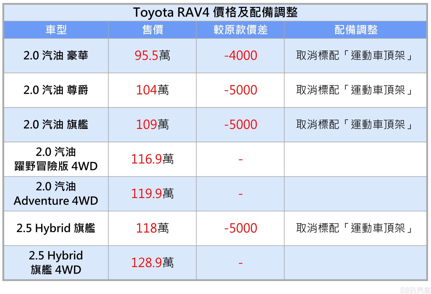 Toyota RAV4自即日起調降前驅車型之售價,其中入門款「2.0豪華」降價4000元,而2.0尊爵、2.0旗艦及2.5 Hybrid旗艦三車型皆降價5000元,至於4WD車型則未受影響,維持原價與原配置銷售。