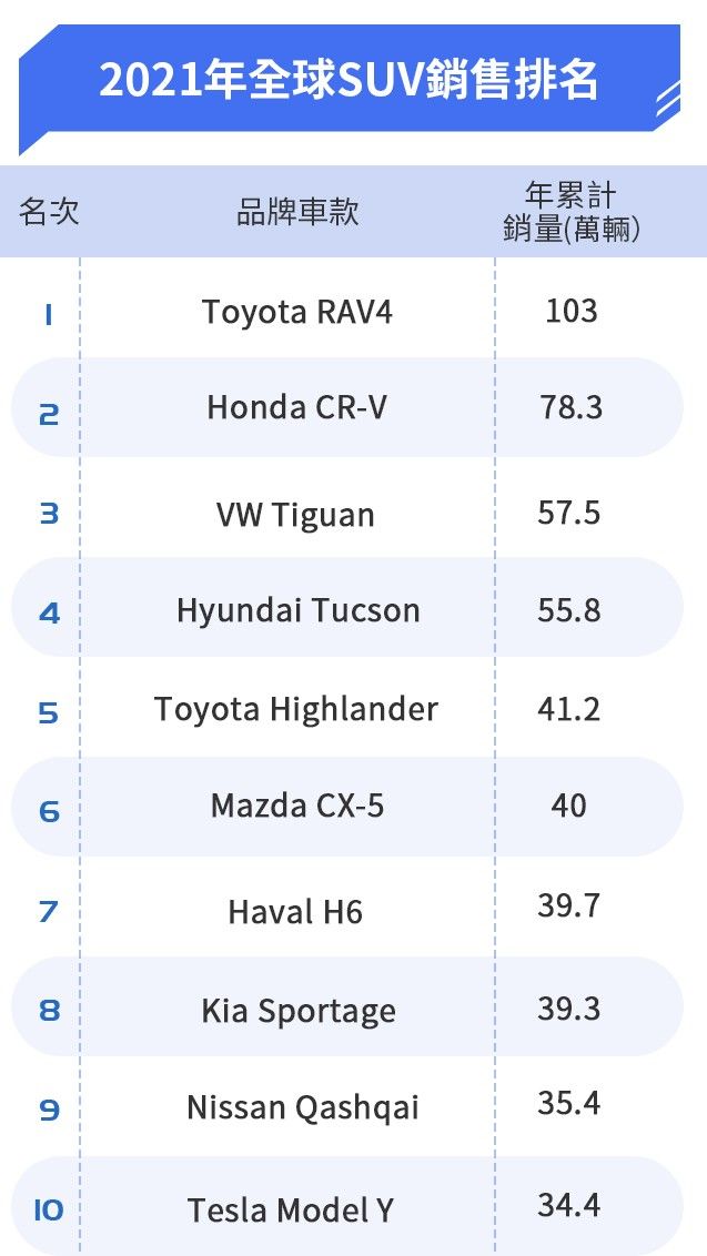 Honda CR-V和VW Tiguan分別拿下第二、三名的位置,前者搶下前三算是正常發揮,且相較2020年正成長幅度約一成,Tiguan雖於2021年度開始以小改款車型的新鮮度持續搶攻各地市場,不過原廠明顯受到疫情影響,使其銷量比起2020年仍有著約5%的負成長。