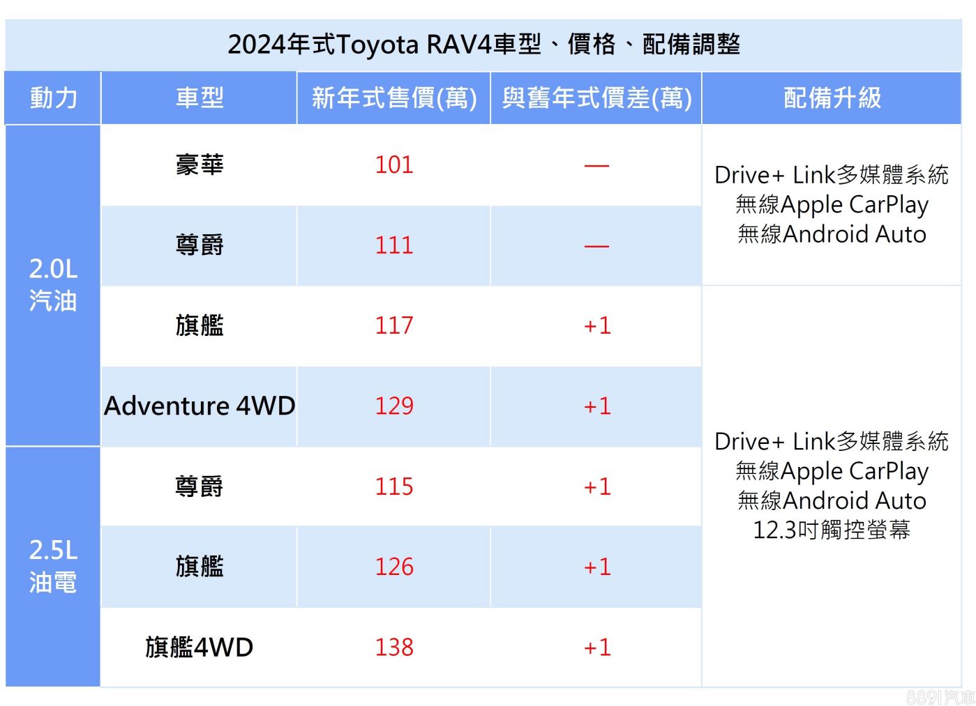 Toyota新年式RAV4車型編成不變,汽油規畫豪華、尊爵、旗艦、Adventure 4WD四種車型,建議售價依序為101萬、111萬、117萬、129萬,而油電動力則供應尊爵、旗艦、旗艦4WD三版本,開價分別為115萬、126萬、138萬,除了汽油入門及二階凍漲外,其餘車型階調漲1萬。