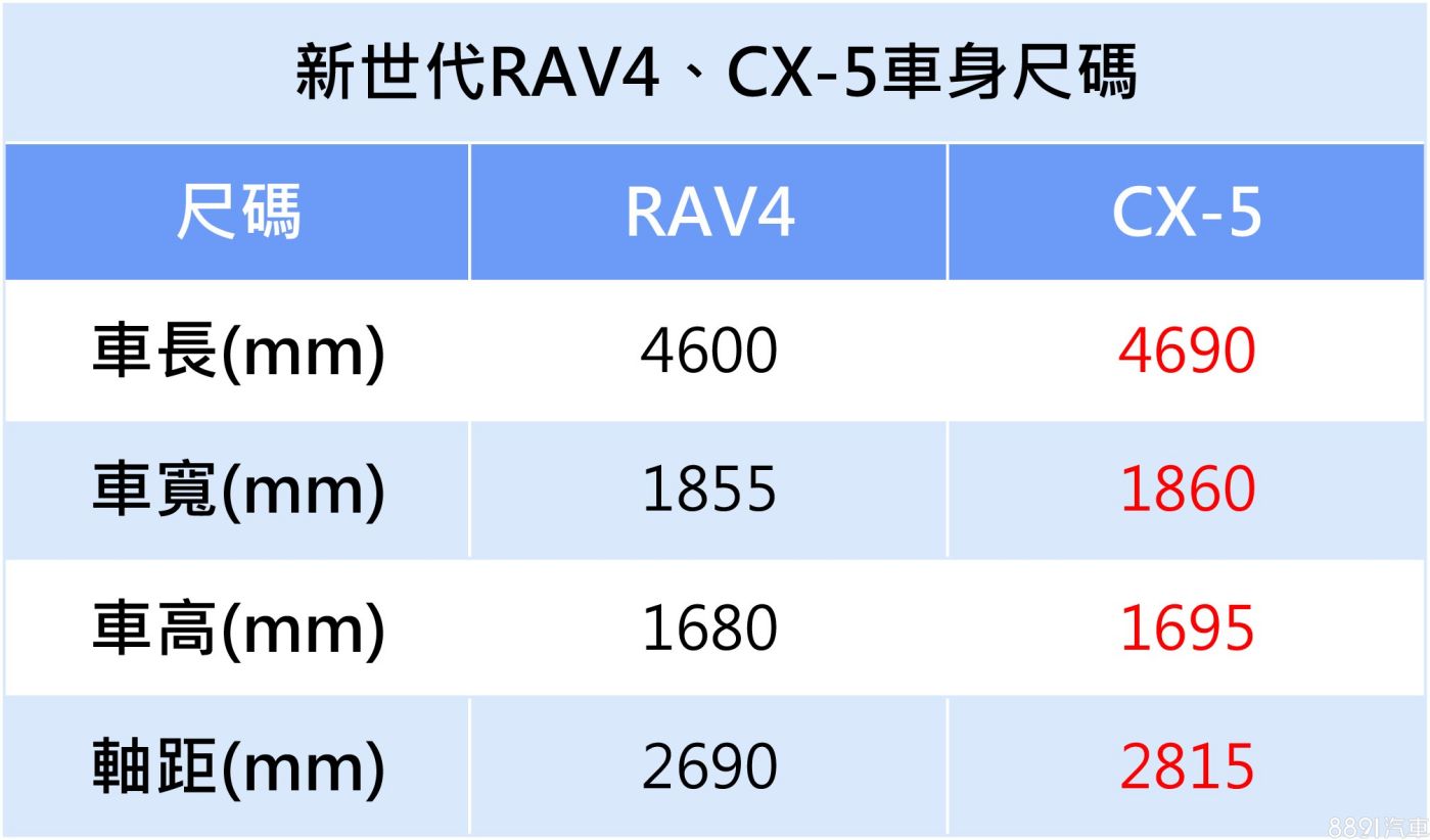 新世代RAV4與前代尺碼幾乎如出一轍,反觀大改款CX-5,尺碼全面放大,原廠數據軸距更是增加了11.5公分,雖說新RAV4相信也會維持傳統,提供不俗的乘載體驗,不過更讓人期待多些的反倒是CX-5,畢竟自海外媒體實際體驗的影片看來,後排膝部空間確實明顯增加,就連身高近190cm的成年男子入座,都依舊保有充裕的頭膝部空間!