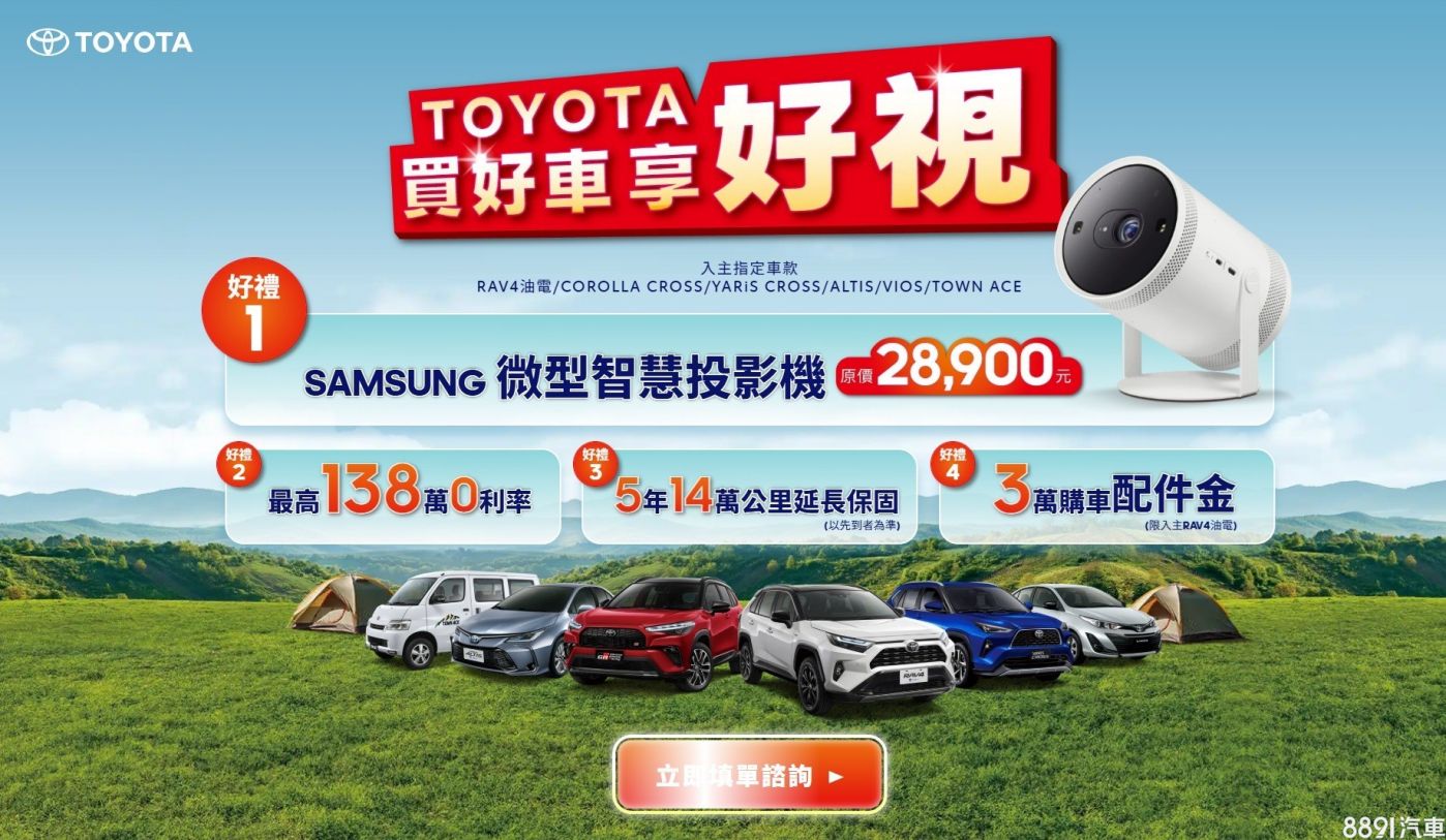 和泰12月推「買車享好視」活動,入主油電RAV4享最高138萬0利率、5年14萬公里延長保固、3萬元購車金,再送市價28900元的三星微型智慧投影機。