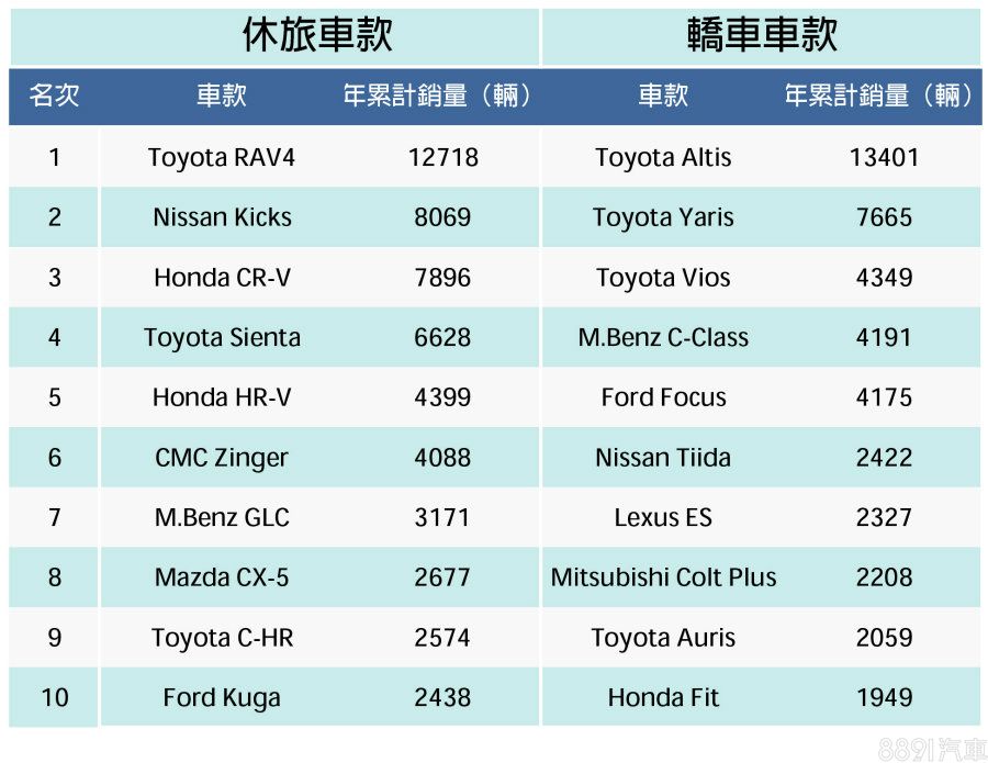 從銷售表現上,可見國內休旅風潮依舊,入榜各休旅銷量普遍較轎車車款來的高。而不論休旅或轎車市場,均由Toyota車款拿下鰲頭,RAV4與Altis並在各自的類別中,同樣繳出唯一破萬(均約1.3萬)的銷售表現!