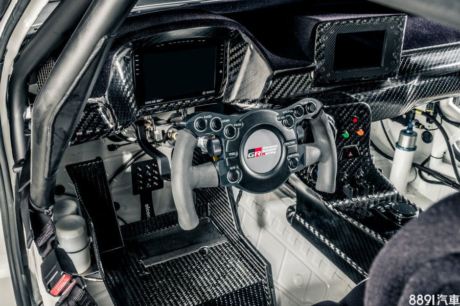 GR Supra GT4嶄新的內裝設計與保有市售造型儀錶台的概念版截然不同,以「一切從簡」為原則,不僅造型簡要,並採碳纖維材質達到輕量化效果。車內以雙螢幕做為主要資訊來源,方向盤也自概念車的圓盤改為競技化的蝶形方向盤。