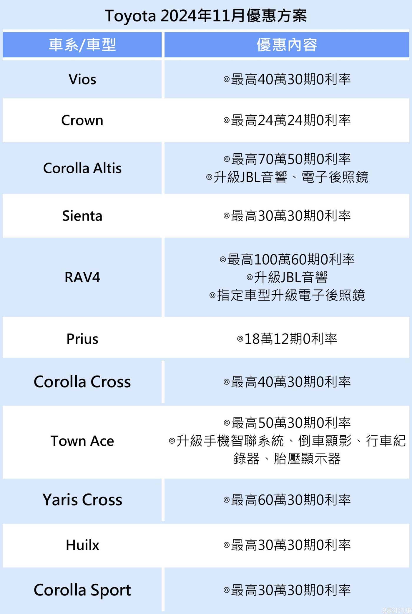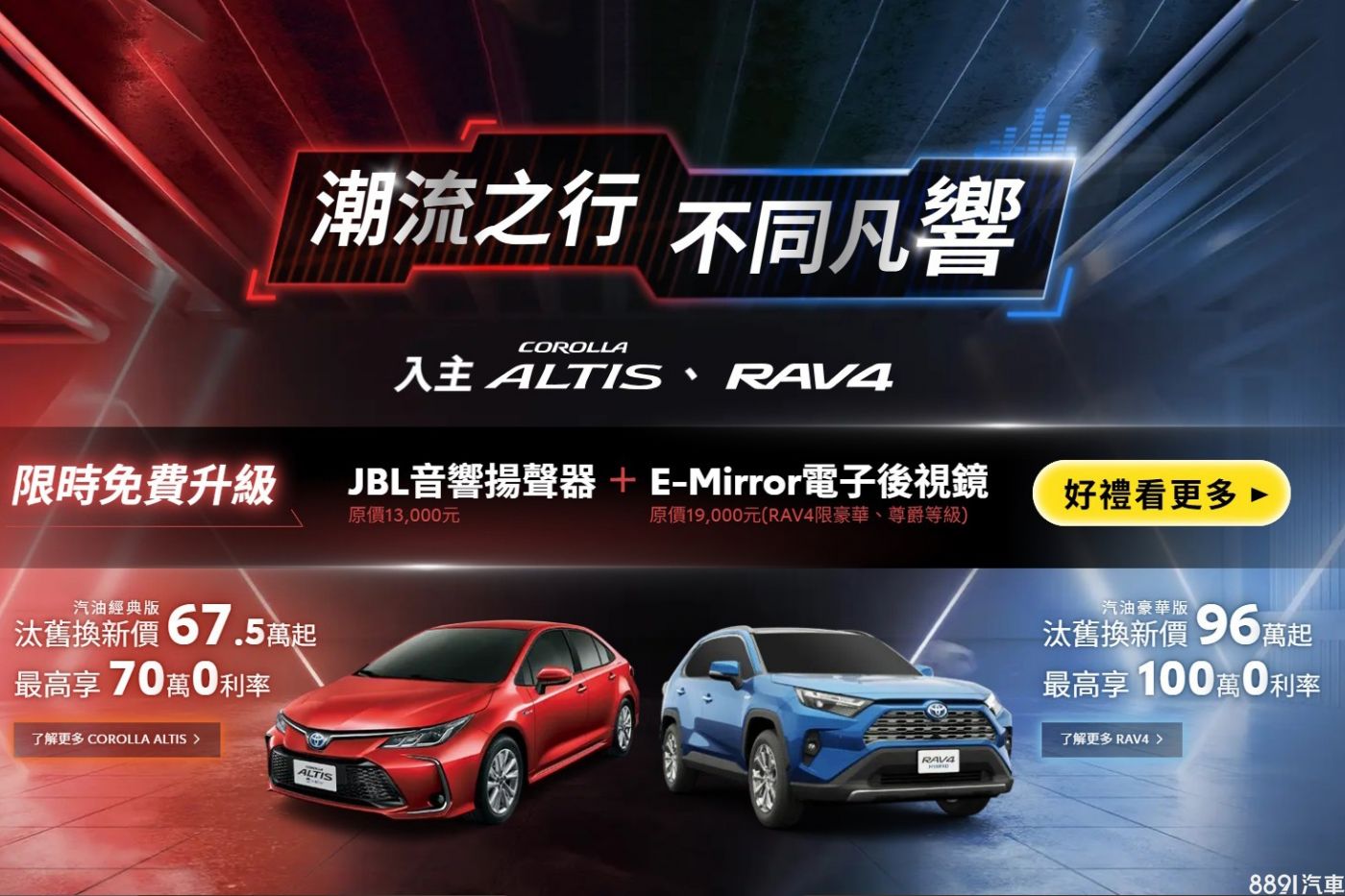 Toyota指定車型享配備免費升級 還有高額0利率 作者:邵逼 2024-11-01 2,415 溫馨提示:文字共127個字,3張圖,閱讀約需要1分鐘 11月入主Toyota指定車款,除了享高額0利率,實用部件、配備升級等好康。 針對RAV4、Altis和Town Ace,Toyota在11月都祭出免費配備升級的優惠,前者追加JBL音響、電子後照鏡;後者則囊括手機智聯系統、倒車顯影、行車紀錄器、胎壓顯示器等。 其他車型也均適用高額0利率,相關詳情可洽官網或各地展間。 8891汽車【車友交流群】熱情招募中! 想要加入8891車友大家庭嗎?這裡有專業的小編與熱情的車友們為你解答買車,用車,養車甚至是修車的疑問!討論每日趣聞,分享個人經驗,想以車會友,現在就加入! 上一篇 下一篇 請選擇您覺得沒幫助的原因 您的意見對我們和其他買家都很重要唷 沒有我想看的 像廣告文 比較不夠詳盡 比較不夠全面 內容與事實不符 文章內容不具參考性 其他 確定 取消 資訊 頭家們要注意!豐田Town Ace國內宣布召回木床車型 邱翔 2025-04-28 3738 和泰宣布召修Toyota Town Ace木床系列車型,第一橫樑及起動馬達有瑕疵,有收到通知的車主要留意!【詳情】 普發1萬 Toyota推車主有禮活動 RAV4、bZ4X祭重磅優惠 賴文森 2025-11-03 1169 Toyota RAV4末代祭推138萬60期0利率,bZ4X早鳥再享隨插即充吃到飽,搭配普發1萬健檢回饋活動,立即掌握Toyota 11月優惠重點。【詳情】