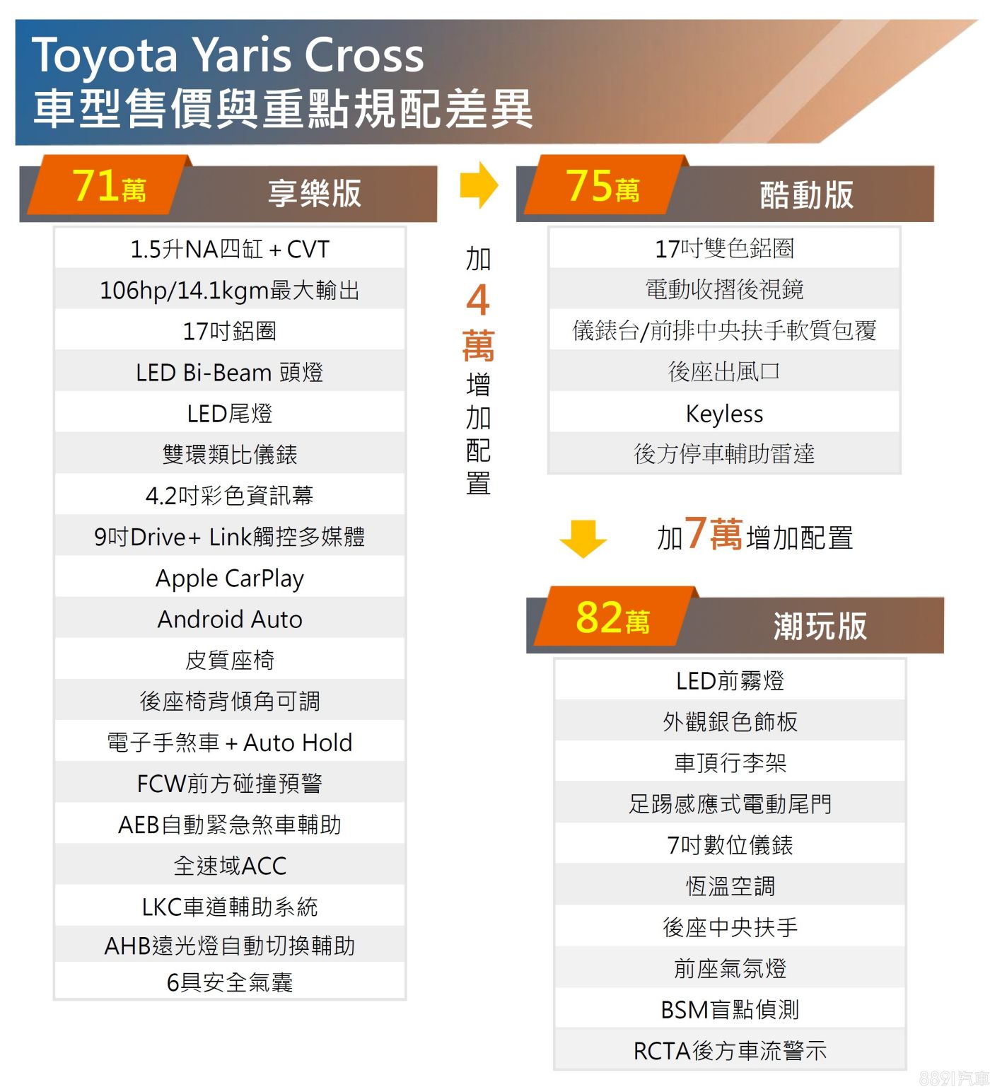 國產版Yaris Cross規劃單一動力,提供享樂版、酷動版、潮玩版三車型,售價依序為71萬、75萬與82萬,相比預售價降了1.5萬,據和泰汽車表示,新車於8月下旬開放預購後,截至目前已累積超過2000張訂單,並且喊出年販2萬台的銷售目標。