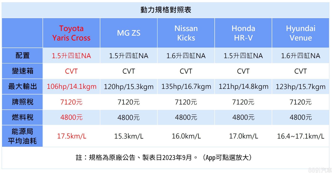 雖說Yaris Cross海外另有油電版可選,但國產版目前僅供1.5升自然進氣汽油引擎+CVT的組合,此設定與同級對手不相上下,都是入門級小休旅常見的動力配置,且稅金都是在同一個等級。就帳面數據來看,輸出是Kicks略大一些,油耗則是Yaris Cross表現最出色。