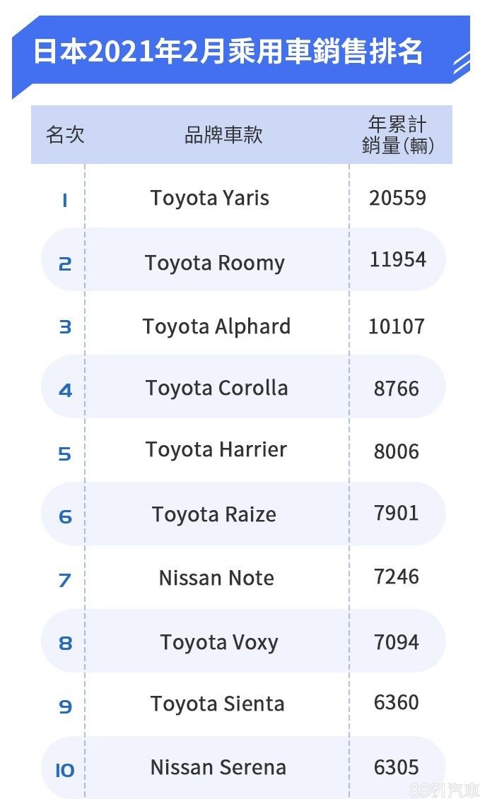 近日出爐的日本2月份乘用車銷售排行榜再次由Toyota車系橫掃,前10名中有8名皆是豐田車!備受矚目的焦點仍是自去年7月分開始就連霸冠軍至今的Yaris,本月繳出20559輛,較1月份的18516輛再創新高,也是繼去年9月份後再次突破2萬輛大關,買氣相當強勁!