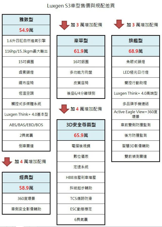 去年五月發表的S3,為Luxgen首台小型房車產品,沿襲品牌一貫強調的科技項目掛帥,自然相較其他對手擁有先天優勢,60萬以內可選擇的兩種車型,擁有恆溫空調、觸控式多媒體系統、ABS、BAS、EBD、BOS、2氣囊、倒車雷達、360度環景與車側安全影像輔助等配備,也算應有盡有。