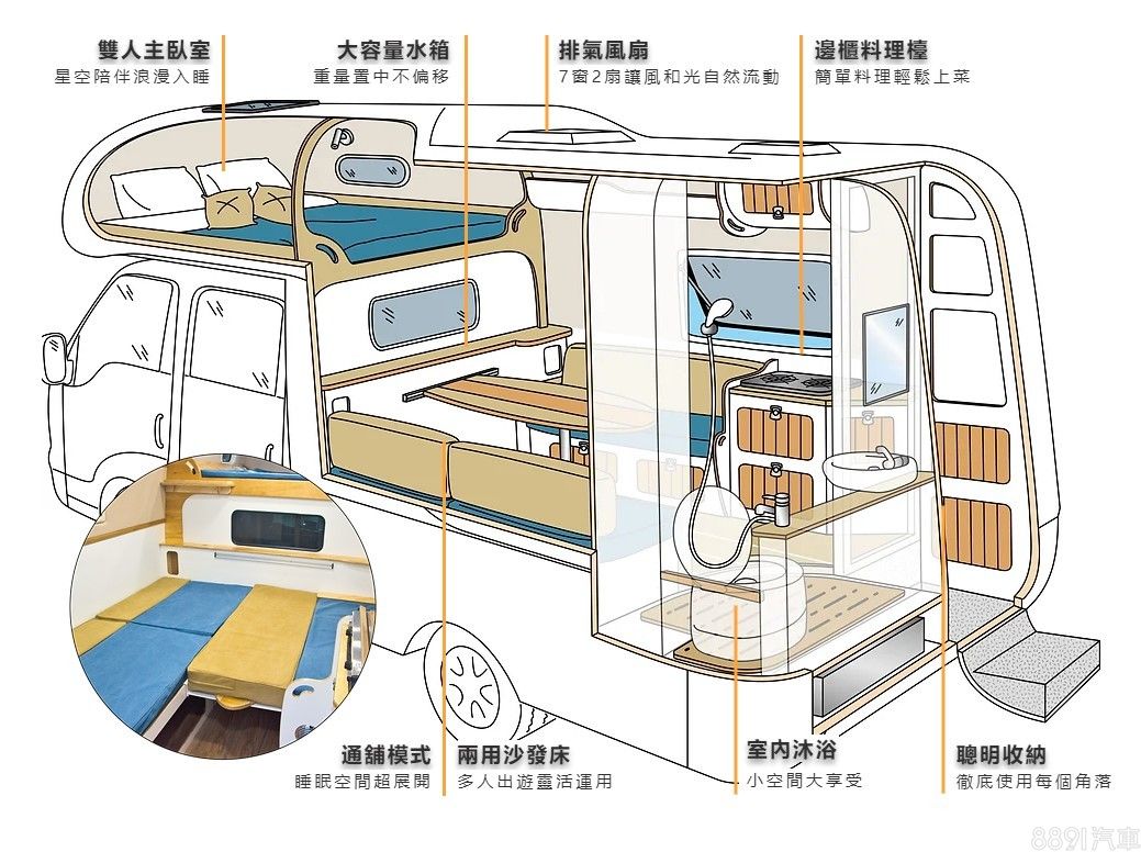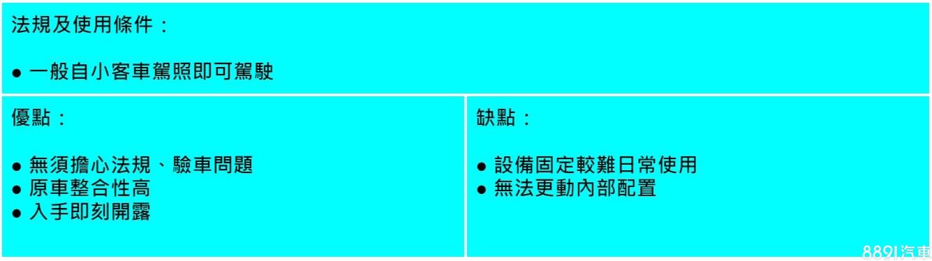 如果是沒有露營經驗的小白,手中銀彈又充足的話,編者最推薦自走式露營車,最大優點就是整合性高,車內床鋪、水、電設備都幫你準備好了,且在原廠整合設計下,安全性高、收納機關都做得很完整,出廠皆經過完整測試,這可不是自己改得出來的。也由於原廠出品,當然無須擔心法規、車輛檢驗問題,持有比照一般新車辦理即可。