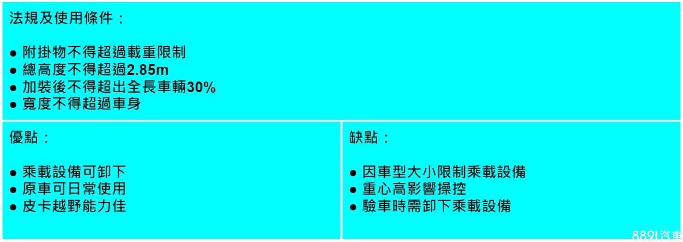 乘載式露營車廂在國內尺寸、重量受到法規限制,簡單來說不得超過自身車輛最大載重限制,高度、高度也有明確規範,因此車內空間相對自走式較為侷限。另一個問題是,如果選擇皮卡車型加裝車廂,載重高,重心也變高,底盤、懸吊系統強化勢在必行,才能維持一定的駕駛體驗。