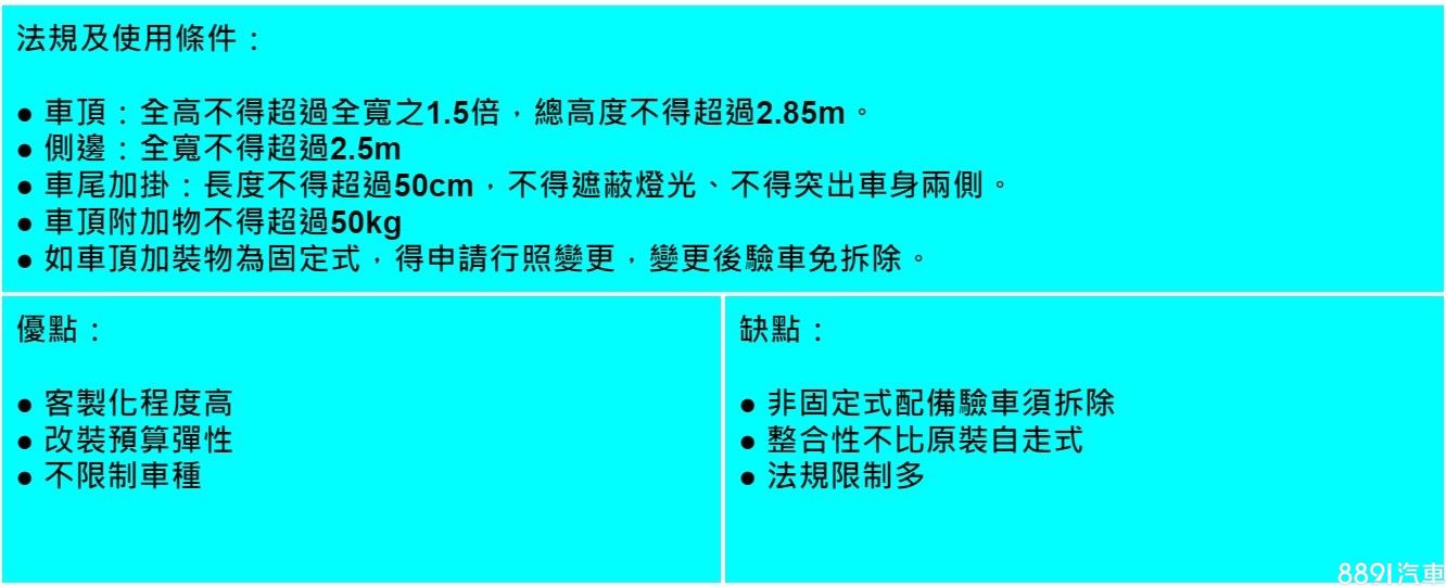 外觀加裝配件的話,目前最流行的屬加掛車頂架、車頂帳篷,通常都會採用可拆卸式設計,要出門露營的話再背上車,由於沒有對車體進行變更,所以驗車時把架子拆下來即可,算是相當親民好入門的車宿方式,但不論車頂加掛、車尾加掛,尺寸都要在法規限制之內。但如果加裝物為固定式,就必須要申請行照變更註記,才能合法上路。