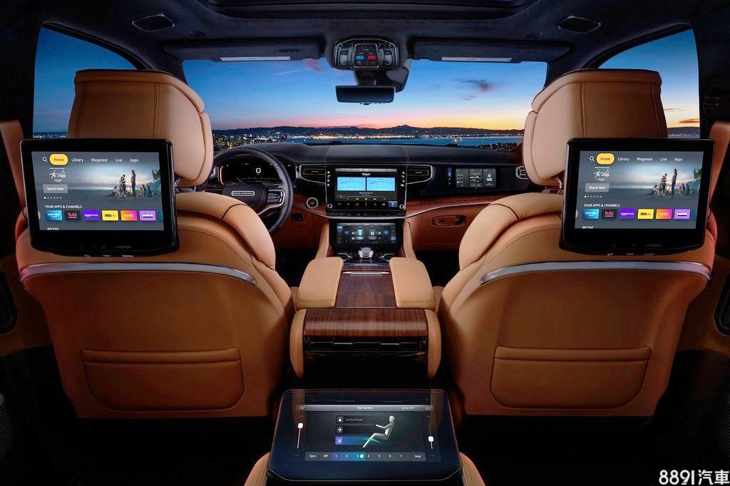 Grand Wagoneer是Jeep品牌中最大的車型,這輛豪華三排大型SUV基本上把所有你想的到的車載娛樂配備都給裝上去了,內裝用料就是體現「高、大、上」三個字,高檔皮革加上大量的觸控面板,讓人宛如置身一輛陸地上的巡洋艦一般。