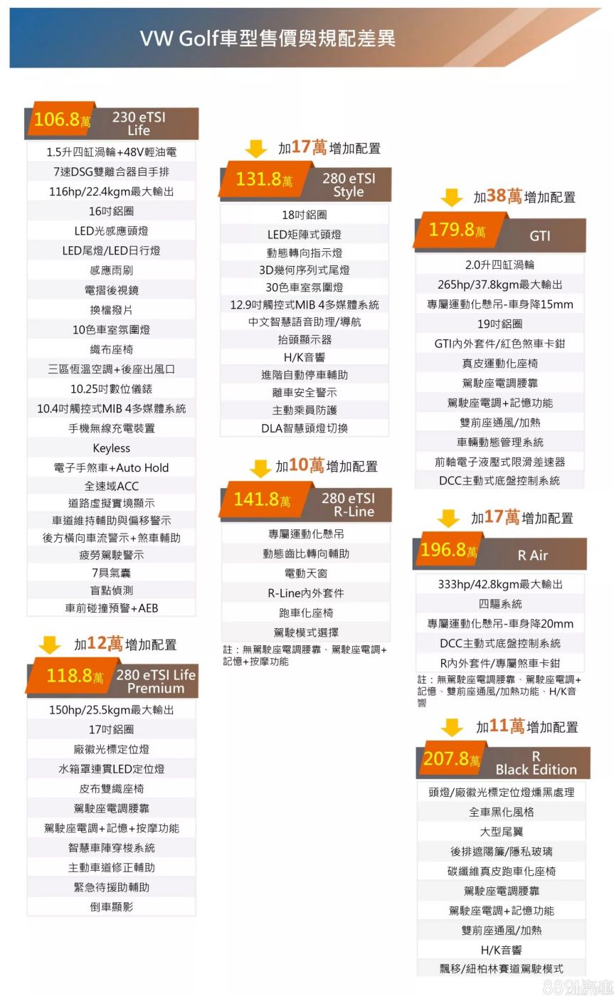 掀背款同樣也有Style和R-Line兩款280 eTSI車型,不過另加入230 eTSI Life和280 eTSI Life Premium作為較入門的選擇,價格帶落在106.8~141.8萬。此外,車系另有179.8萬的Golf GTI,還有分別要價196.8萬、207.8萬的R Air和R Black Edition可選,滿足訴求動力性能的消費客群。