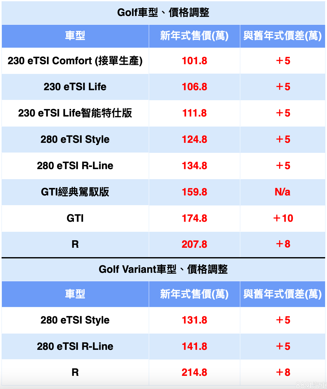 敵不過大環境,2023年式Golf、Golf Variant車系再度面臨漲價的命運,全車系漲幅從5萬起跳,而GTI與R兩款性能版本則分別調漲10萬與8萬。