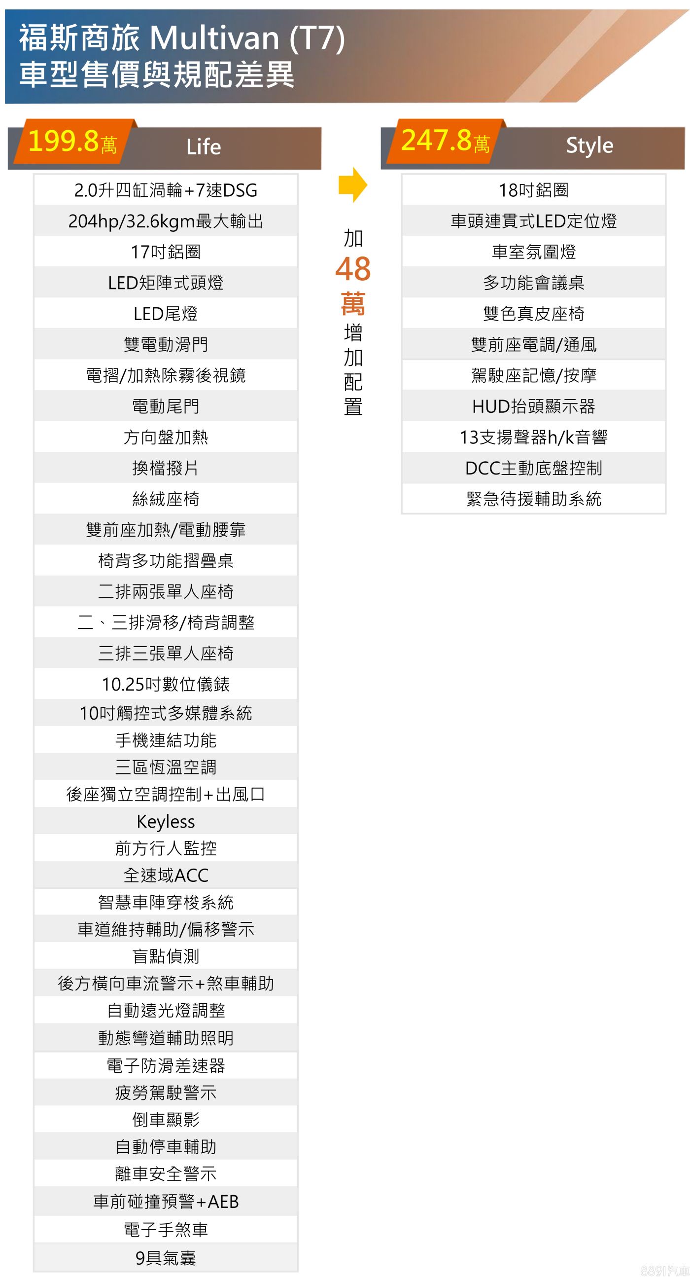 新一代Multivan採3124mm單一軸距設定,但供應標準車長的「Life」和加長版的「Style」兩種車型選擇,加長版增加了後懸長度,藉以換來更充裕的尾廂空間。兩車型定價分別為199.8萬與247.8萬,11月底前掛牌則可分別享有3萬、4萬折扣,優惠限額68台。
