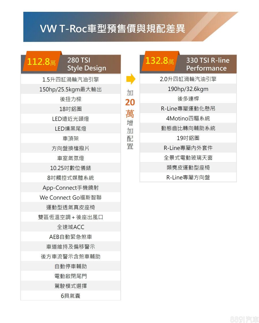 繼日前釋出數張T-Roc披上彩繪外衣遊走台北街頭的照片後,預售規格近日終於出爐,共分成280 TSI Style Design與330 TSI R-Line Performance兩種車型,接單價各為112.8萬與132.8萬。