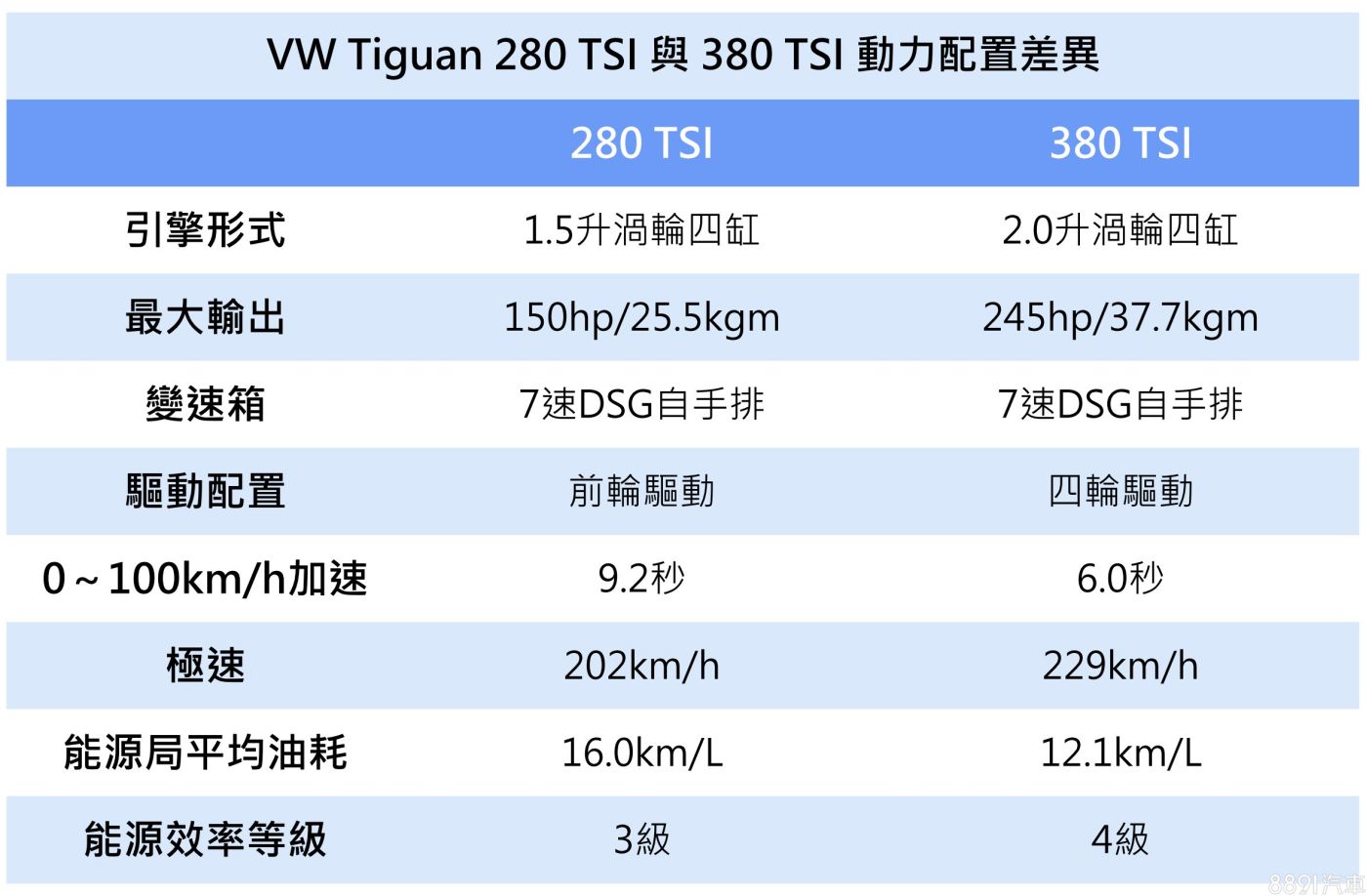 不過最大不同還是在動力方面,380 TSI搭載2.0升渦輪四缸引擎,具備245hp/37.7kgm最大輸出,搭配7速DSG雙離合器自手排及4Motion四驅系統,官方指出6秒整便可自靜止加速至100km/h。